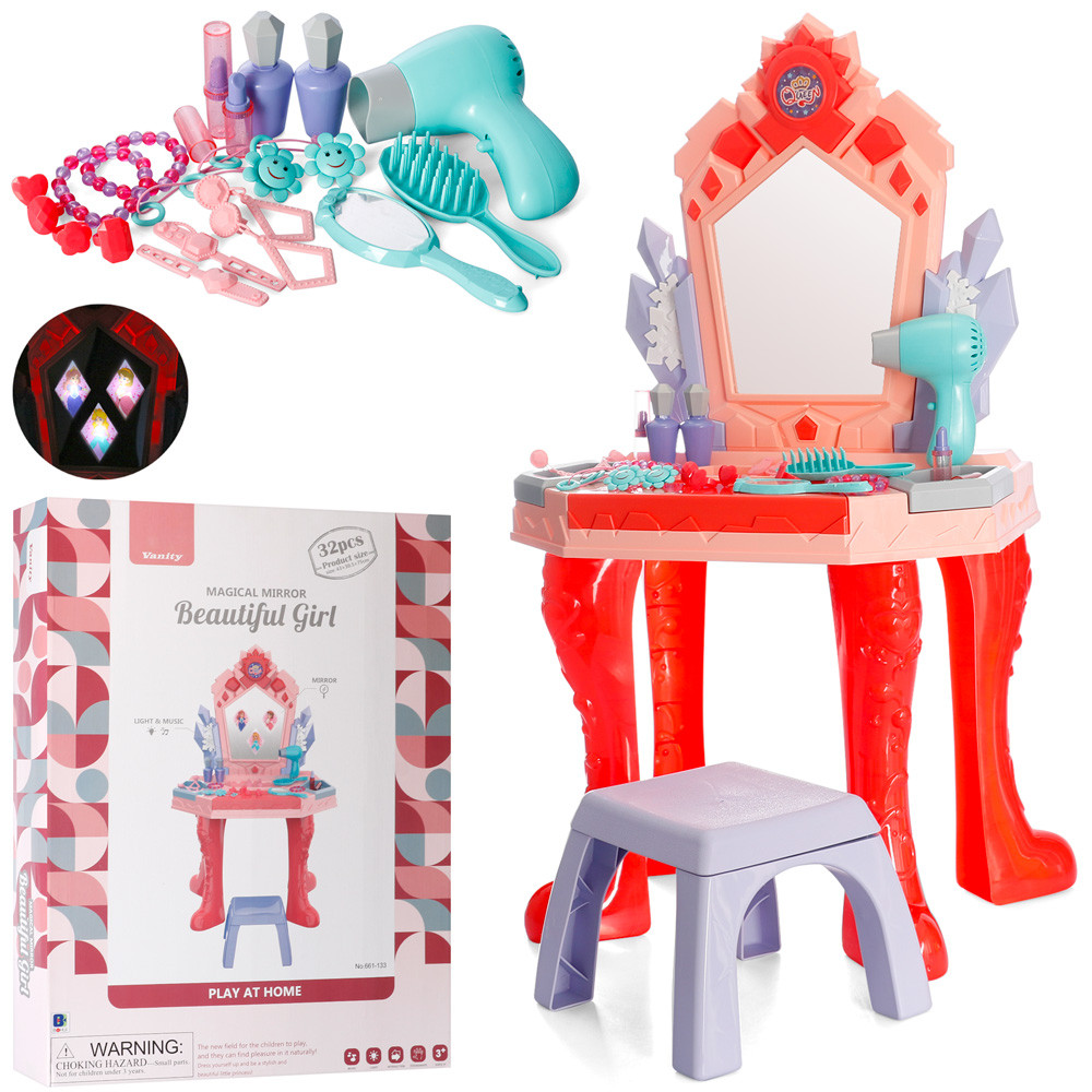Головною особливістю трюмо є додаткові звукові та світлові ефекти: натисніть на м'яку кнопку та почуєте казкову мелодію. До комплекту також входять додаткові аксесуари, включно з різними прикрасами, щітка для волосся, гребінець і функціональний фен.